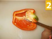 Iniziate questa ricetta, lavando accuratamente il peperone sotto l'acqua corrente (1), dopo ponetelo su un tagliere, dividetelo a metà e togliete le parti vegetali e le parti bianche all'interno (2), dopo con un coltello dalla lama seghettata, tagliatelo finemente a striscioline (3). Una volta conclusa questa operazione, lasciate da parte dentro un piatto fondo.