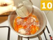 Una volta che l'olio ed il porro sono ben caldi, unitevi le striscioline di peperone lavorate in precedenza (7), mescolate bene con un mestolo di legno (8), ed unitevi anche i bocconcini di carne di vitella (9).