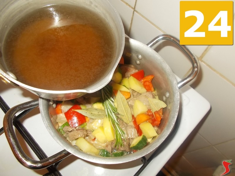 Ora unite anche le foglie di alloro (22) e il rametto di rosmarino (23). Infine coprite la carne con il brodo (24) ben caldo. Mescolate bene e coprite con un coperchio e iniziate una lenta cottura a fuoco basso, controllando e mescolando di tanto in tanto. Lasciate cuocere per circa due ore, facendo restringere il brodo fino ad ottenere un sughetto denso di fondo. Se necessario aggiungete altro brodo. Una volta cotto fate riposare dieci minuti prima di servire in tavola.