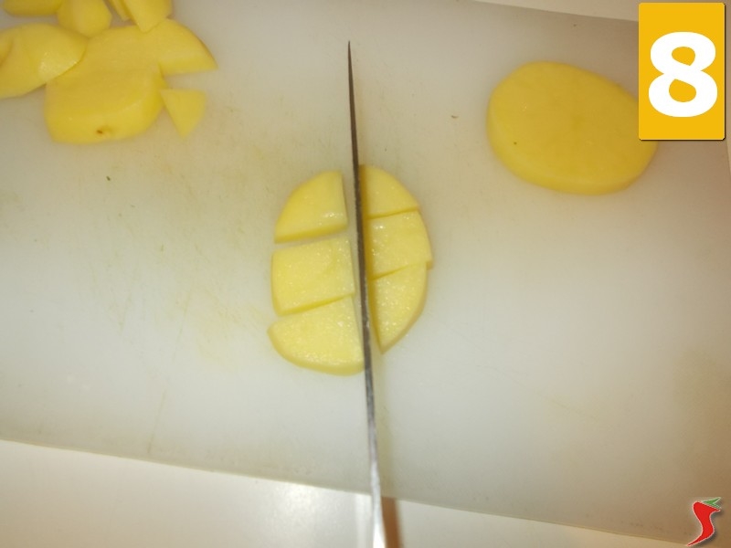 Quindi iniziate a manipolare la patata, sbucciatela (7) con il pelapatate e quindi tagliatela a dadini (8) da mettere a parte (9) in una ciotolina.