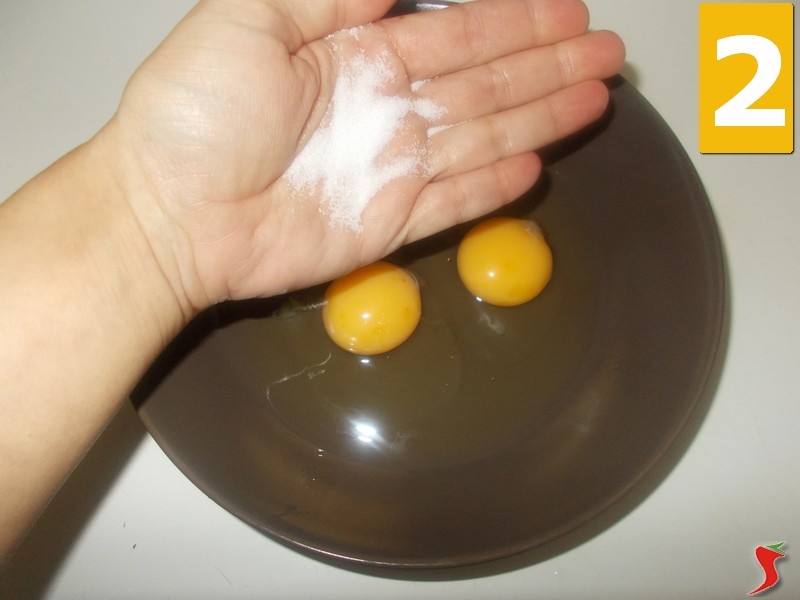 Iniziate la seguente ricetta rompendo le uova in un piatto fondo da portata (1), facendo attenzione a non far cadere la buccia nel piatto, e se dovesse accadere, con un cucchiaio eliminatele subito, dopo aggiustate di sale fino senza eccedere troppo perché come sappiamo poi le uova risulterebbero molto saporite vista l’aggiunta in un secondo momento della farcitura (2). Una volta sbattute accuratamente, lasciate da parte il composto nello stesso piatto (3).