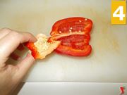 Prendete l'ortaggio e ponetelo sopra un tagliere, dopo con un coltello dalla lama seghettata inizialmente dividetelo in due e dopo eliminate tutte le parti vegetali (4), una volta terminata anche questa lavorazione, con lo stesso coltello iniziate a realizzare delle striscioline molto sottili (5) e dopo lavate il peperone sminuzzato sotto abbondante acqua corrente utilizzando uno scolapasta e sempre strofinando con le mani per eliminare non solo i residui di terra, ma anche i semini bianchi che restano attaccati nella polpa del peperone (6). Una volta ben puliti, lasciate da parte dentro un piattino fondo.