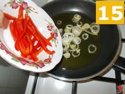 A questo punto aggiungete due cucchiai abbondanti di olio di oliva extravergine sul fondo di una padella di medie dimensioni con il fondo antiaderente (13) e fate riscaldare a fiamma bassa, proseguite unendovi le rondelle di porro realizzate precedentemente (14) ed una volta rosolate, unitevi il peperone rosso a striscioline (15).