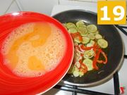 Una volta ben cotte le verdure, unite nella padella le uova sbattute e condite con sale fino lavorate in precedenza (19), dopo lasciate cuocere per circa cinque minuti a fiamma bassa e coprite la padella con un piatto fondo, dopodiché giratela e ponetela nuovamente nella padella (20). Lasciate cuocere ancora per qualche minuto ed una volta pronta, tagliatela a spicchi e mette la vostra frittata alle verdure su un piatto piano. Servite la pietanza con del buon vino bianco dai sapori fruttati.