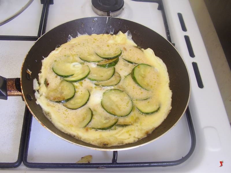 Quando le zucchine saranno cotte prendete le uova sbattute e versate uniformemente sulle zucchine, in modo da riempire tutti gli spazi, anche sottostanti, e iniziare a creare la frittata. Aggiustate con un cucchiaio di legno le parti non coperte dall'uovo e lasciate cuocere per 4 minuti la parte inferiore.Quindi prendete un piatto piano, poggiatelo sulla padella e girate la frittata con il classico capovolgimento della padella nel piatto. Quindi mettete di nuovo la frittata con la parte non cotta sul fondo per altri 5 minuti sempre a fuoco medio, in modo da finire di cuocerla. Una volta cotta ponetela su un piatto grande a centro tavola. Po essere servita calda o fredda, in fette o cubetti.