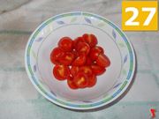 Intanto lavate bene i pomodorini ciliegino (25) sotto l'acqua corrente, quindi asciugateli e tagliateli in due parti (26) sul tagliere. Metteteli in una ciotolina (27) a parte.