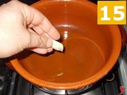 Ora versate in un tegame di terracotta sei cucchiai di olio extravergine di oliva (13) e fateli scaldare. Intanto sbucciate lo spicchio d'aglio (14) e quindi mettetelo a dorare (15) nel tegame.