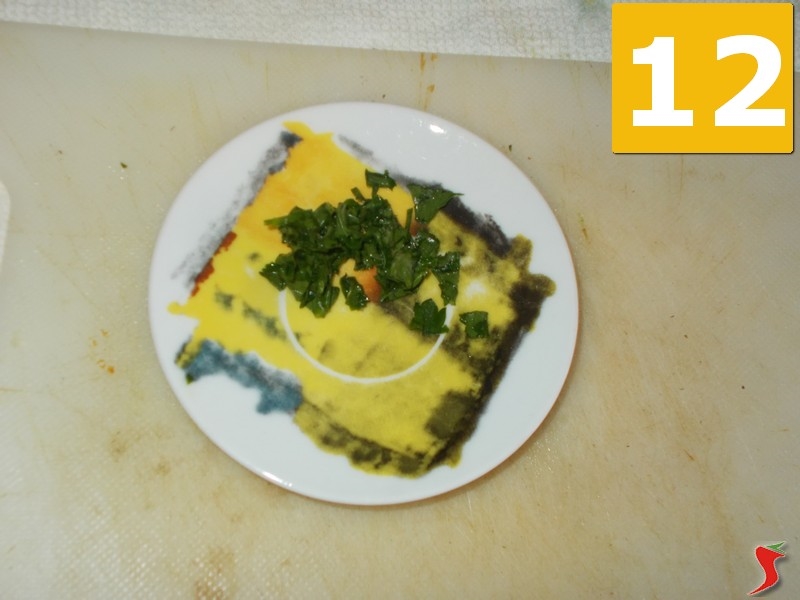Quindi lavate bene il prezzemolo (10) sotto l'acqua corrente, asciugatelo e poi tritatelo (11) grossolanamente sul tagliere. Quindi mettete tutto su un piattino (12) a parte.