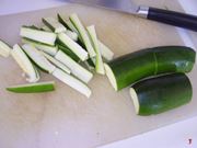 Intanto che le carote vengono scottate pensate alle zucchine. Lavatele bene, privatele delle estremità. Quindi tagliate le zucchine in tre parti e iniziate a tagliarle a bastoncini. Quindi mettete da parte.