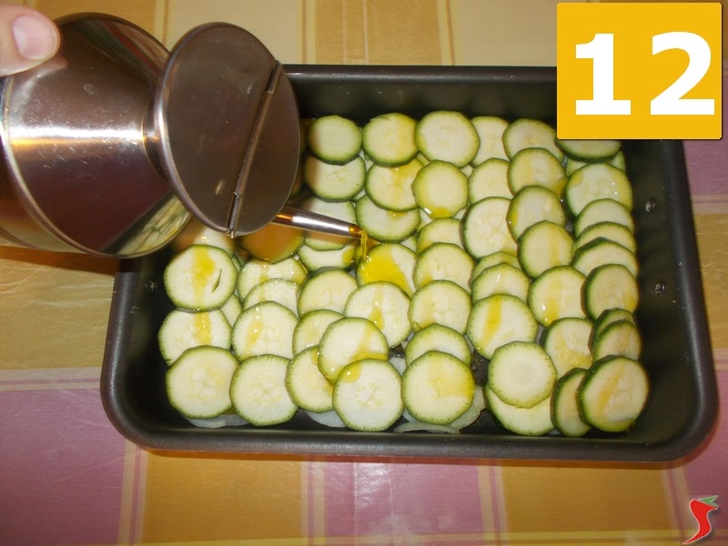 Adesso aggiustate di sale fino la cipolla a vostro gradimento (10) ed unitevi sopra le rondelle di zucchine realizzate nel passaggio iniziale (11). Proseguite unendo ancora un po di olio extravergine di oliva circa un cucchiaio (12).