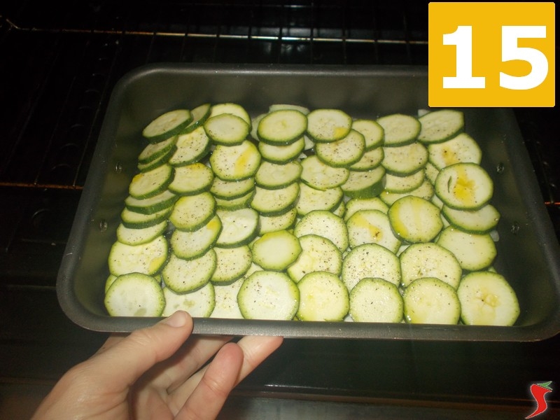 Ora spolverate di pepe misto macinato fresco sopra l'ortaggio (13) ed aggiungetevi ancora un pizzico di sale fino (14). Una volta terminate il condimento, mettete a cuocere in forno preriscaldato a 150 gradi per circa trenta minuti (15).