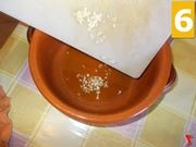 Prendete 1 spicchio d'aglio e sbucciatelo per tritarlo finemente (4), quindi versate cinque cucchiai di olio extravergine di oliva (5) in un tegame di terracotta e uniteci anche l'aglio tritato (6).