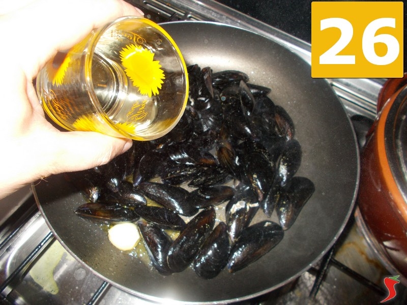 Una volta che l'aglio è dorato, unite le cozze (25) alla padella. Alzate la fiamma al massimo e unite il vino bianco (26) restante sulle cozze, e il prezzemolo. Coprite con un coperchio (27) e fate aprire tutti le cozze, per circa cinque minuti.