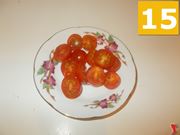 Intanto lavate bene (13) anche i pomodorini e poi asciugateli e poneteli sul tagliere. Quindi con il coltello seghettato, per non rovinare la lama con l'acidità dell'ortaggio, tagliateli in due parti (14) e quindi metteteli in una ciotolina (15) per utilizzarli in seguito.