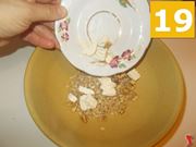 Quindi prendete le noci, sgusciatele e tagliate le ghiere in due parti (16). Poi iniziate a tagliare la ricotta in cubetti (17) da mettere anch'essi a parte (18) in un piattino.