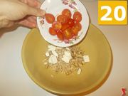 Ora avete tutti gli ingredienti pronti e dovrete solo unirli in un'insalatiera per creare il vostro piatto. Nella stessa insalatiera dove avete messo il farro a raffreddare unite i cubetti di ricotta (19) e le noci, i pomodorini tagliati (20) e infine tutti i vegetali lessati (21). Quindi versate un filo d'olio e mescolate bene per amalgamare il tutto. Servite in tavola come insalata insieme a qualche piatto di carne o di pesce grasso, oppure come antipasto.