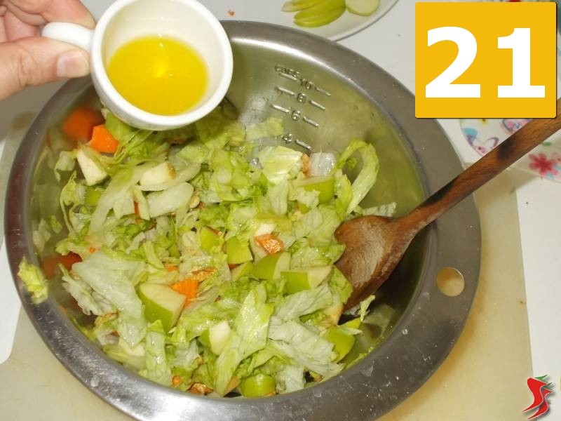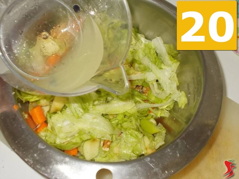 Quindi condite l'insalata a partire dal sale (19). Mescolate ed aggiungete anche il succo di limone (20) e per ultimo l'olio (21), mescolando sempre bene ad ogni passaggio.