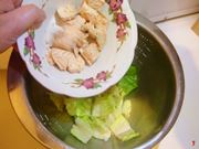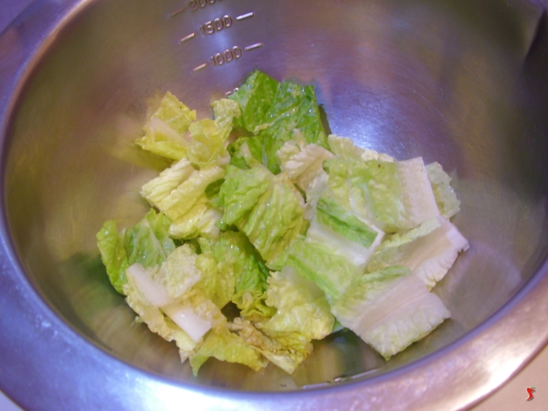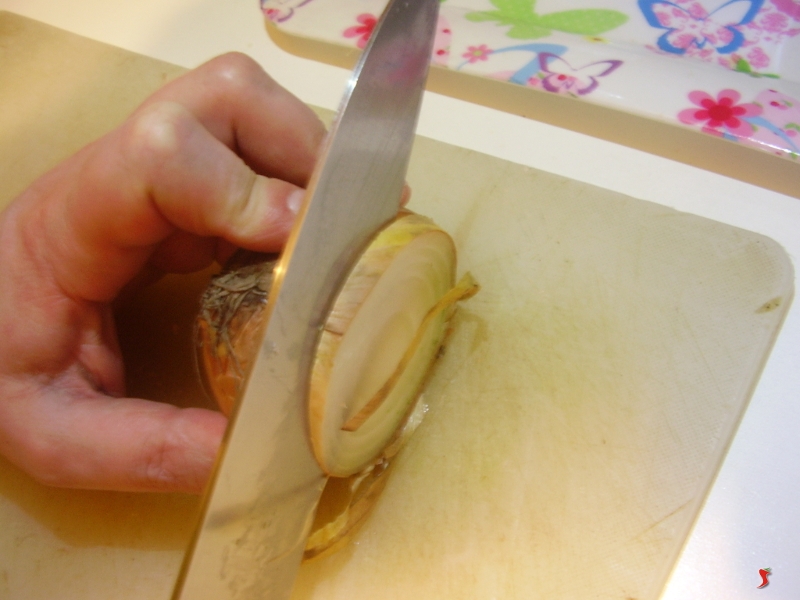 Ora mettete il salmone nella planetaria con l'insalata e tagliate la mezza cipolla a rondelle, per unirla all'insalata.