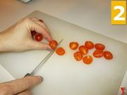 Cominciate la ricetta lavando bene i pomodorini (1) sotto l'acqua corrente per poi asciugarli e metterli sul tagliere. Quindi con il coltello seghettato per non rovinare l'affilatura della lama con l'acidità del pomodoro, tagliateli in due parti (2) e metteteli in una ciotolina (3).
