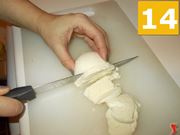 Mentre le patate si lessano sgocciolate la mozzarella e iniziate a tagliarla (13) in fette sottili (14) da mettere in un piattino (15) a parte.