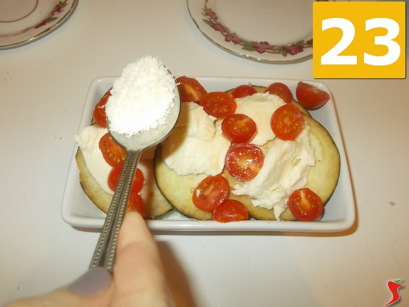 Iniziate il secondo strato terminando sempre con i pomodorini (22) nello stesso modo del primo, quindi spolverate il tutto con del parmigiano grattugiato (23) e del pepe nero (24) macinato fresco.