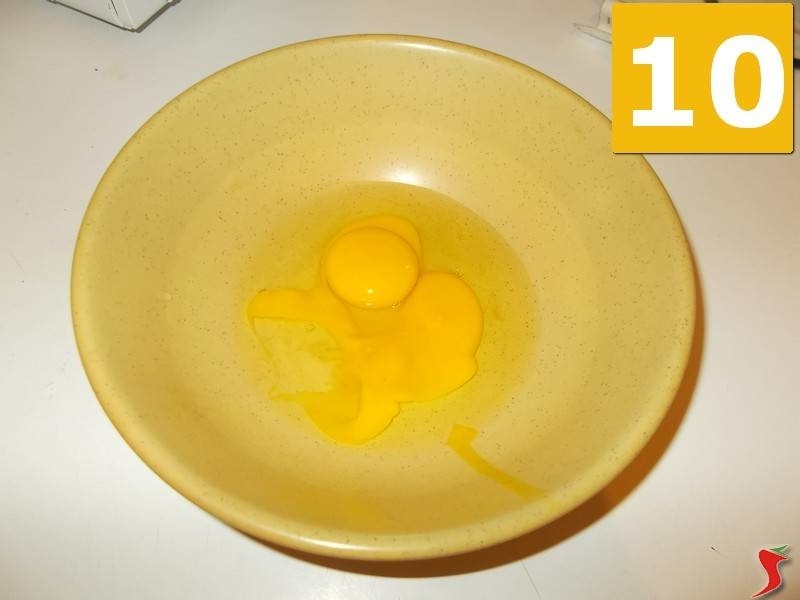 Adesso rompete le due uova (10) in una ciotola, e salatele leggermente per sbatterle bene (11) con una forchetta. Quindi mettete la farina (12) in un piatto a parte, distribuendola bene.