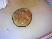 Ora prendete una fetta di melanzana, salatela leggermente e metteteci sopra un cucchiaio di salsa. Poi metteteci una fetta di mozzarella e coprite con un'altra fetta di melanzane.