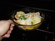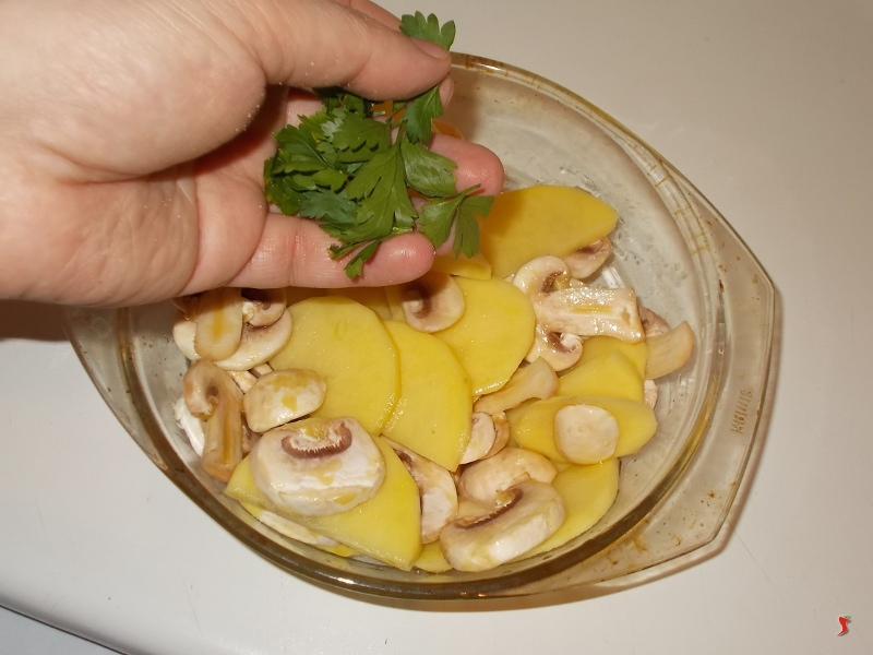 Dopo aver salato mescolate e quindi versate sopra le patate e funghi quattro cucchiai di olio extravergine di oliva. Mescolate ancora e quindi mettete sulle patate le foglie di prezzemolo distribuite in tutta la pirofila.