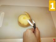 Naturalmente comincerete la ricetta dalle patate, l'ingrediente principale e l'unico da manipolare. Quindi sbucciatele (1) con il pela patate e mettetele sul tagliere. Con il coltello grande tagliatele a pezzi (2) abbastanza piccoli di circa 1 centimetro di spessore, e metteteli a parte in una ciotolina (3) per utilizzarle subito dopo.