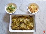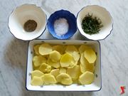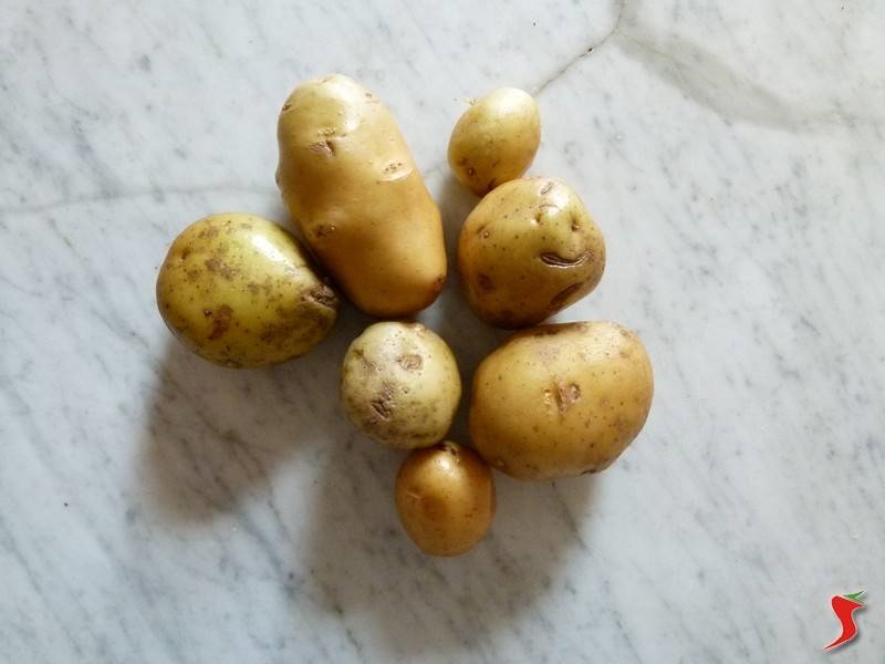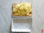 Nel momento in cui si sono raggruppati tutti gli ingredienti necessari procedere con lo sbucciare delle patate. Una volta che queste vengono pelate, procedere con il loro taglio. La forma che esse dovranno assumere può essere soggetta al desiderio del cuoco: a cubetti, a cerchi.