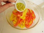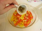 I peperoni ora devono essere messi in una pirofila il cui fondo può essere leggermente unto di olio. Prendete quindi l'olio con l'aglio e versatelo a filo sui peperoni. Mettete poi la metà dei capperi per profumare il piatto.