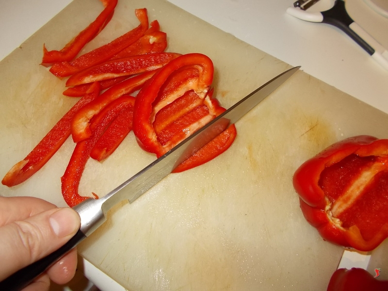 Pensate ora ai peperoni, iniziando con il lavarli accuratamente. Quindi tagliateli in due e iniziate ad eliminare le parti vegetali, i semi, e le parti bianche, da tagliare via con un coltello ben affilato. Quindi lavateli accuratamente anche internamente sotto l'acqua corrente per eliminare tutti i residui di semi e fateli asciugare.