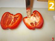 Iniziate la ricetta con il taglio e la pulizia dei peperoni. Prendeteli singolarmente e tagliateli a metà (1), quindi, con il coltello, eliminate tutte le parti vegetali e quelle bianche interne (2). Infine lavateli con cura (3) sotto l'acqua corrente, per eliminare tutti i semi. Lasciateli ad asciugare e proseguite.