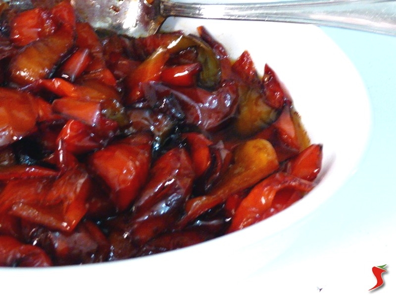 La preparazione è davvero semplice, dopo avere lavato i peperoni li tagliamo a bastoncini e li tuffiamo in una padella sul cui fondo avremo fatto riscaldare dell'olio di semi.Cuociamo inizialmente a fiamma vivace, e quando i peperoni iniziano a prendere calore aggiungiamo lo zucchero che oltre ad esaltare il gusto dolce del peperone gli conferirà un bel colore caramello in cottura. Quando i peperoni saranno "caramellati" abbassiamo il fuoco e portiamo a cottura, il tempo può variare molto in base al grado di maturazione dei peperoni e della quantità di acqua contenuta. Mediamente serviranno 20 minuti circa. Aggiungiamo sale quanto basta a bilanciare il dolce, e una volta spento il fuoco aggiungiamo una bella spruzzata di aceto, anche questo dipende un po' dai gusti, magari iniziate con una piccola spruzzata e assaggiate. I peperoni preparati in questo modo si conservano anche più giorni, vale quindi la pena di prepararne in grande quantità.