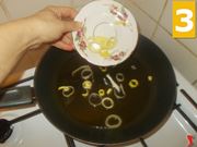 Cominciate la ricetta a partire dal soffritto che utilizzerete per la cottura degli ortaggi. Quindi lavate bene il porri e iniziate ad affettarlo (1) sul tagliere a fettine molto sottili. Poi versate cinque cucchiai di olio extravergine di oliva (2) in una padella ampia ed antiaderente e fateli scaldare a fuoco medio. Una volta caldo unite il porro (3) a soffriggere finché non diviene trasparente.